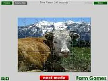Alpine Cow Jigsaw ay isang napaka-interesanteng jigsaw game sa sakahan sa internet. Sa nakakatuwang larong ito sa sakahan, may larawan ng isang magandang baka sa alpine. Kailangan mong pumili ng game mode. Pumili mula sa apat na ibinigay na game mode: madali, katamtaman, mahirap, at eksperto. Sa unang mode, ang larawan ay hahatiin sa 12 piraso, sa ikalawang mode sa 48, sa ikatlong mode sa 108, at sa huling mode, ang larawan ay hahatiin sa 198 maliliit na piraso. Ngayon pagkatapos mong pumili ng mode, maaari mo nang simulan ang paglalaro ng astig na larong ito. Pindutin ang shuffle at handa ka nang laruin ang kahanga-hangang libreng laro sa sakahan na ito. Basahin ang mga tagubilin at pagkatapos ay magsimulang maglaro. Ang kailangan mo lang para laruin ang larong ito ay ang iyong mouse. Kailangan mong mag-click sa piraso at i-drag ang piraso sa tamang posisyon. Ingatan ang iyong oras, kung maubusan ka ng oras, matatalo ka sa laro, o maaari mong i-disable ang oras at laruin ang larong ito nang relaks. Maaari mong i-on o i-off ang tunog at makikita mo ang larawan kahit kailan mo gusto sa pamamagitan ng pag-click sa maliit na larawan sa itaas na kaliwang sulok ng screen. Laroin ang astig na larong ito sa sakahan at magkaroon ng maraming kasiyahan at kagalakan!