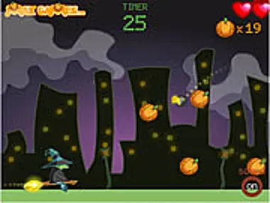 Fly on your broom grabbing as many pumpkins as possible, while dodging the bombs in between.