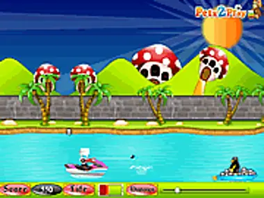 Get ready for an adventurous water ride. Just ride on and hit the opponents with the help of the power you grab on your way. Your life gets reduced if you are hit by the obstacles or by the bombs from the opponent. You lose your game when your life gets over. You score up points according to the number of opponents you hit. The distance you cross is indicated at the right- bottom corner. You move on to the next level when you reach the destination without losing your life completely.