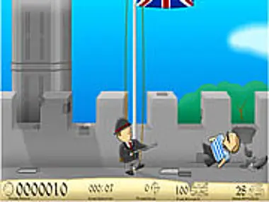 Shoot the incoming enemies as they try to lower your flag. Beat them with the butt of your gun too!