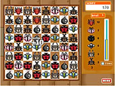 Swap the bugs and try to align 3 or more similar ones in a row to eliminate them, but avoid the bombs.