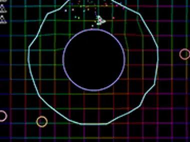 An arcade space shooter filled with explosions, rainbows, and vector graphics