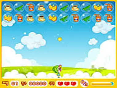 You have a girl with a magic wand and some bubbles in the upper part of the screen. You can launch a star upwards. If the star hits a bubble, its containment falls down. If the bubble contains healthy food like fruits, veggies or fish and you catch it when it falls, you earn points. If it contains unhealthy food it becomes a bomb and hurts you if it falls close. If you collect all healthy food in the line, the line disappears. Otherwise after some time all the bubbles in the bottom line turn into bombs and fall simultaneously.