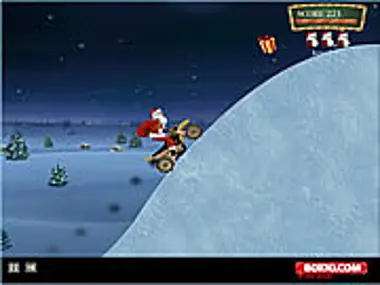 ¡Conduce a Santa en su festiva motocicleta! ¡Sé rápido, ya que tiene regalos que entregar! ¡Recoge los regalos para conseguir puntos, los budines de Navidad para la salud, pero evita los fuegos artificiales!