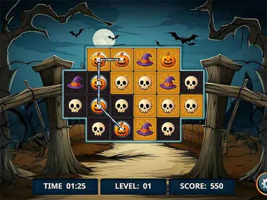 Ang Spooky Chains ay isang masayang Halloween puzzle game. Pindutin ang isang tile at i-drag sa magkakatulad na kalapit na item para makagawa ng chain na 3 o higit pa. Nawawala ang mga item, at nagiging ginto ang mga tile. Ang mga bagong item ay bumabagsak sa mga bakanteng puwesto. Ang iyong layunin ay gawing ginto ang lahat ng tile. Madali ang mga unang level, ngunit ang mga susunod ay nagdudulot ng mas malaking hamon. Minsan, may lumilipad na mangkukulam na dumadausdos sa board. Mag-enjoy sa paglalaro ng Halloween puzzle game na ito dito sa Y8.com!